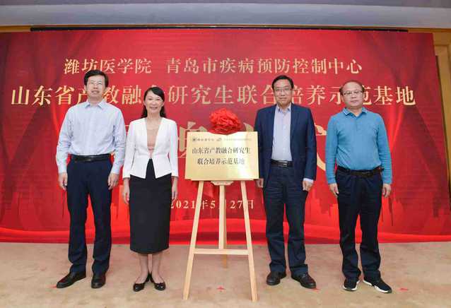 5月27日下午,潍坊医学院与青岛市疾病预防控制中心“山东省产教融合研究生联合培养示范基地”揭牌仪式在青岛市疾病预防控制中心三楼会议室举行。院长管英俊,副院长张建华,青岛市疾病预防控制中心主任高汝钦、党委副书记李善鹏共同为“山东省产教融合研究生联合培养示范基地”揭牌。党委委员、统战部部长、研究生处处长梁淑娟出席活动。