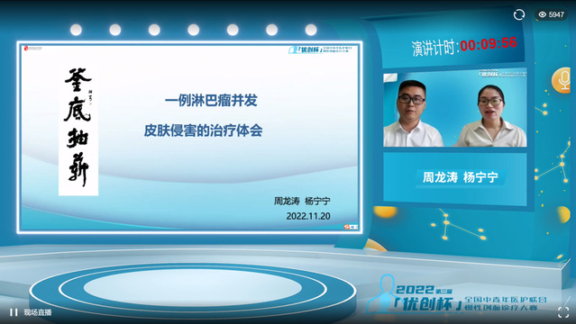 比赛中,骨病与创面修复专业主诊组主治医师周龙涛、伤口造口门诊主管护师、国际造口治疗师杨宁宁汇报的案例《釜底抽薪——一例淋巴瘤合并皮肤侵害的治疗体会》,讲述了一位30岁的女性患者,确诊为NK/T细胞淋巴瘤合并右小腿皮肤侵害,破溃面积蔓延至整条小腿,100%的灰白色肿瘤坏死组织覆盖,经过抗感染和抗肿瘤及创面局部处理等联合治疗后,以惊人的速度完全愈合,至今功能良好。两位选手准备充分、现场发挥稳定突出,大会专家评委对选送的案例质量及选手汇报表现给予高度评价。