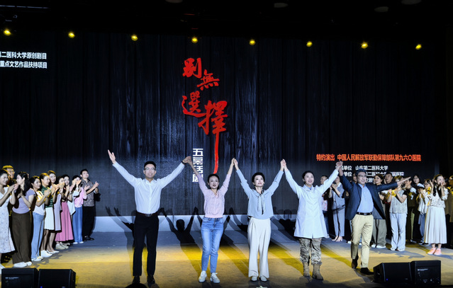 剧中黄南星的这句台词,道出了医务人员心底最深处的情怀与信念。教师节来临之际,应中国人民解放军联勤保障部队第九六〇医院之邀,山东第二医科大学五幕原创医学人文话剧《别无选择》济南站演出在医院综合楼礼堂深情启幕。山东省卫生健康宣传教育中心党委书记吴长远,第九六〇医院院长黄楚恒,学校党委委员、宣传部部长田玉胜,与第九六〇医院教职员工及家属、山东第二医科大学济南校友以及来自海陆空军事医学院校、山东第一医科大学、山东中医药大学等13所院校的大学生近千人共同观看演出。