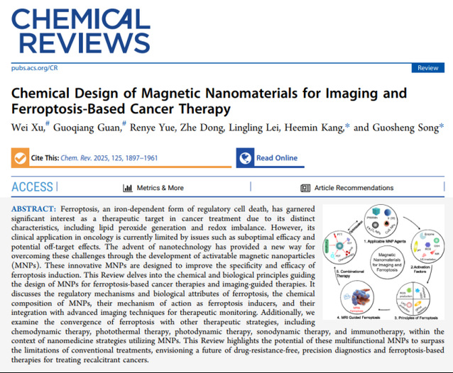 近日,我校生命科学与技术学院重大疾病发病机制及生物药物防治实验室青年教师徐威博士在国际权威期刊Chemical Reviews(中科院1区TOP期刊,IF=55.8)发表题为“Chemical design of magnetic nanomaterials for imaging and ferroptosis-based cancer therapy”的综述论文,我校为第一完成单位,徐威博士和湖南大学关国强博士为共同第一作者。该论文自发表以来,受到本领域学者的广泛关注和引用,目前已成为ESI高被引论文。