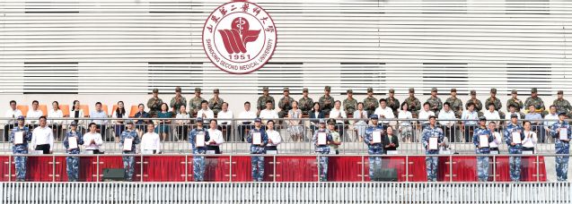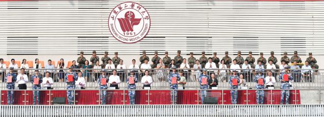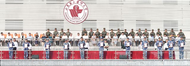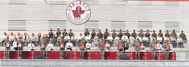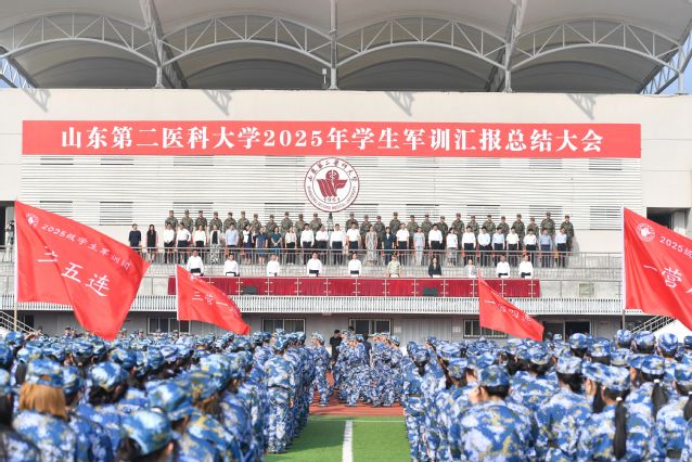 副校长成敏宣读《山东第二医科大学关于表彰2025级学生军事训练先进集体及先进个人的决定》。副校长李士保主持大会。