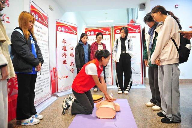 为强化师生应急防护意识,“军桥心跳行动”志愿队在宣讲会开始前,于会场外特设急救培训环节,聚焦心肺复苏术与AED这两项关键急救技能,通过“理论讲解+现场演示”的形式,让在场师生亲身参与操作,切实提升了大家应对突发状况的自救互救能力。