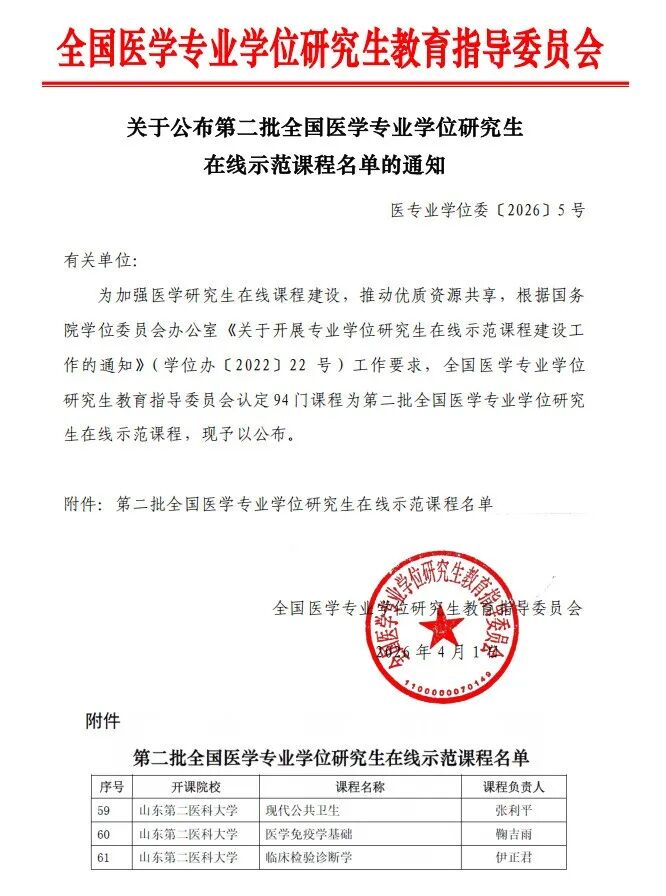 根据国务院学位委员会办公室要求,全国医学专业学位研究生教育指导委员会启动了医学专业学位研究生在线示范课程遴选工作。近日,第二批全国医学专业学位研究生在线示范课程名单正式公布,我校《现代公共卫生》《医学免疫学基础》《临床检验诊断学》3门课程成功入选。