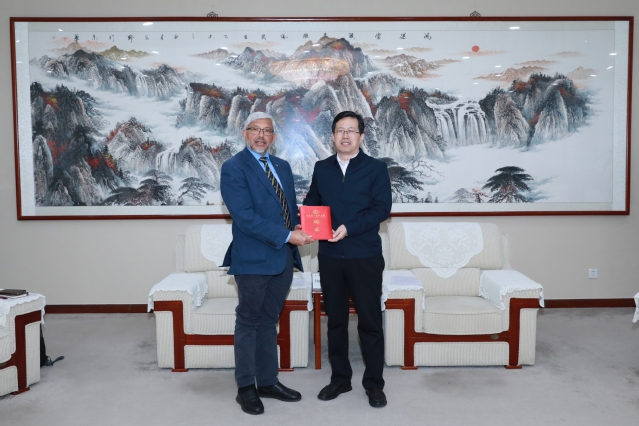 聘任仪式上,张建华代表学校对可汗教授表示感谢。他表示,可汗教授多年来持续为我校学生开设国际课程,积极助力学校国际合作交流事业发展,为学校国际化办学注入了重要力量。学校始终将开放办学作为高质量发展的重要战略,期待以此次聘任为契机,可汗教授能够将国际前沿学术理念、先进理论成果、优质学术资源带入课堂教学、融入科研创新、赋能学科建设,为我校加强国际化师资队伍建设、提升人才培养质量、扩大学术国际影响力提供坚实支撑,推动学校国际化办学水平再上新台阶。